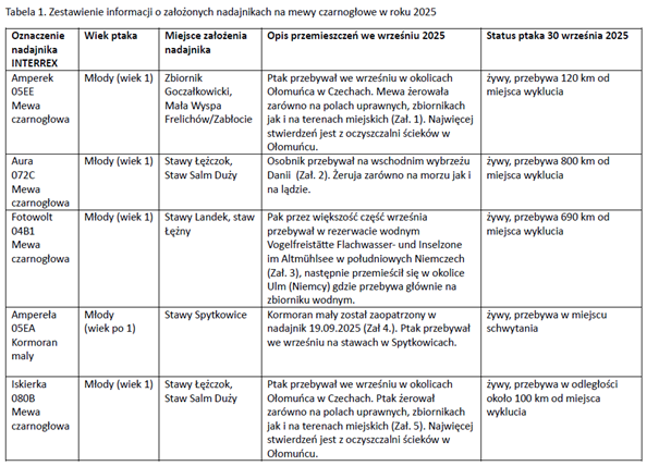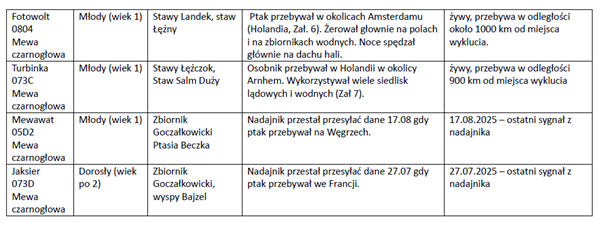 29.09.2025W czerwcu informowaliśmy, że wspólnie z Muzeum Górnośląskim założyliśmy 10 nadajników telemetrycznych INTERREX 4G 18 na mewach czarnogłowych. Obecnie działa siedem z nich – sześć na mewach czarnogłowych i jeden na kormoranie małym. Niestety, dwa urządzenia przestały nadawać: jedno w lipcu (na ptaku dorosłym), a drugie w sierpniu (na młodym osobniku).